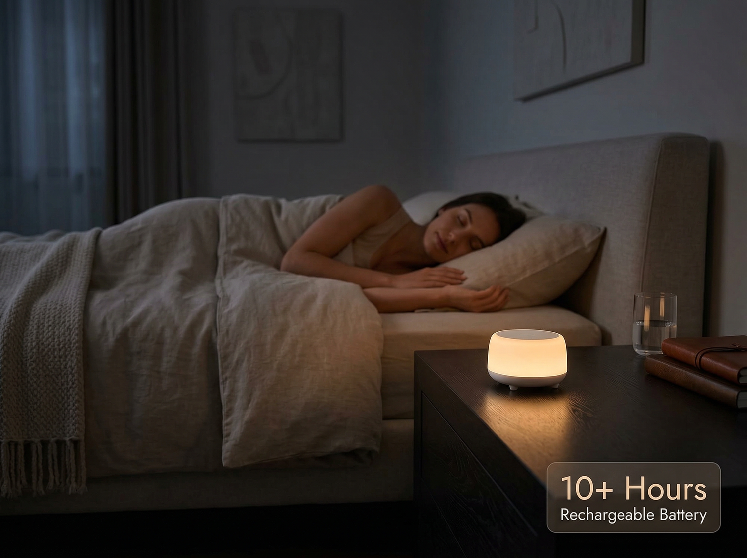 De ingebouwde oplaadbare batterij biedt 10+ uur continu gebruik, wat zorgt voor een hele nacht van rustgevende geluiden en comfort. Het is eenvoudig op te laden via USB-C voor gemak.