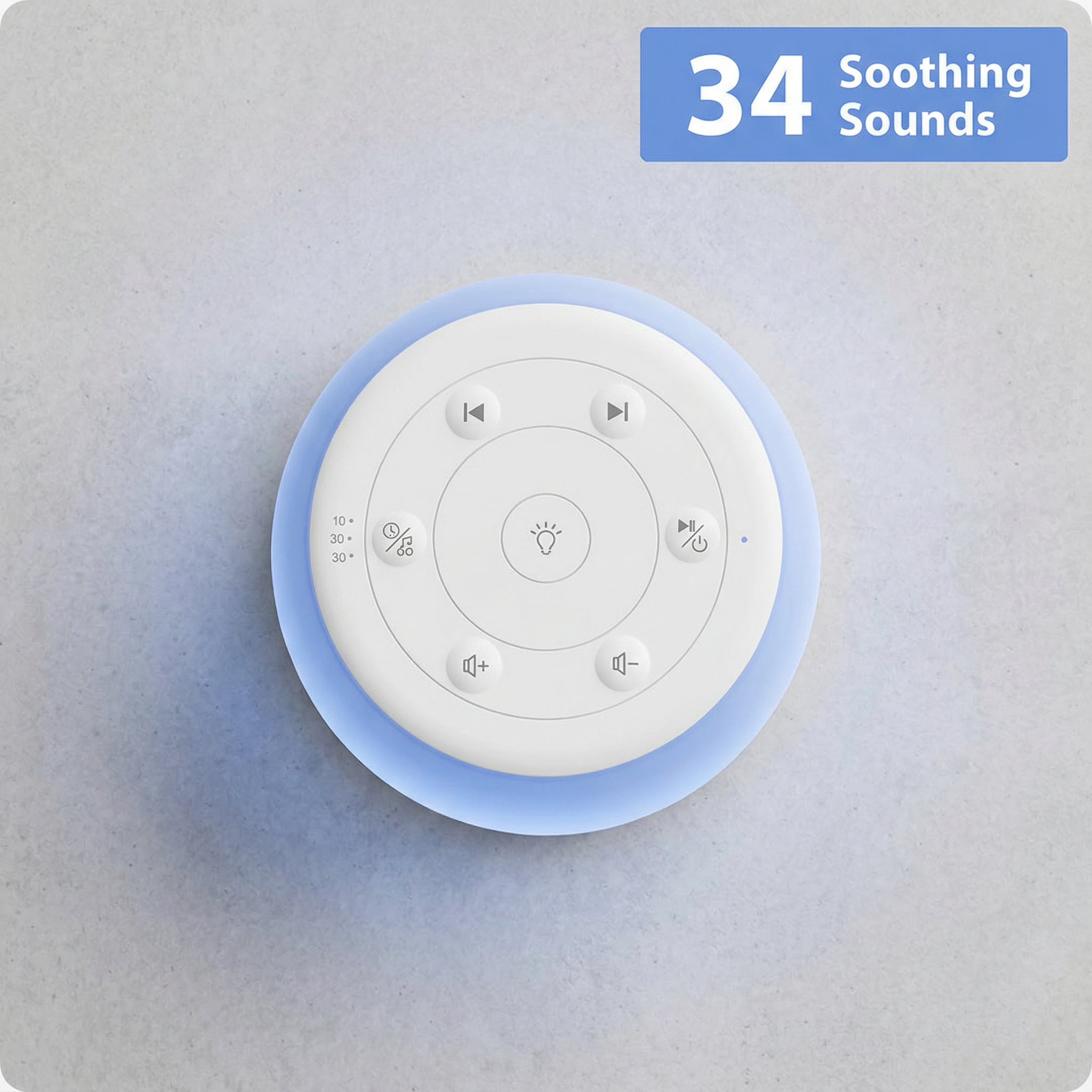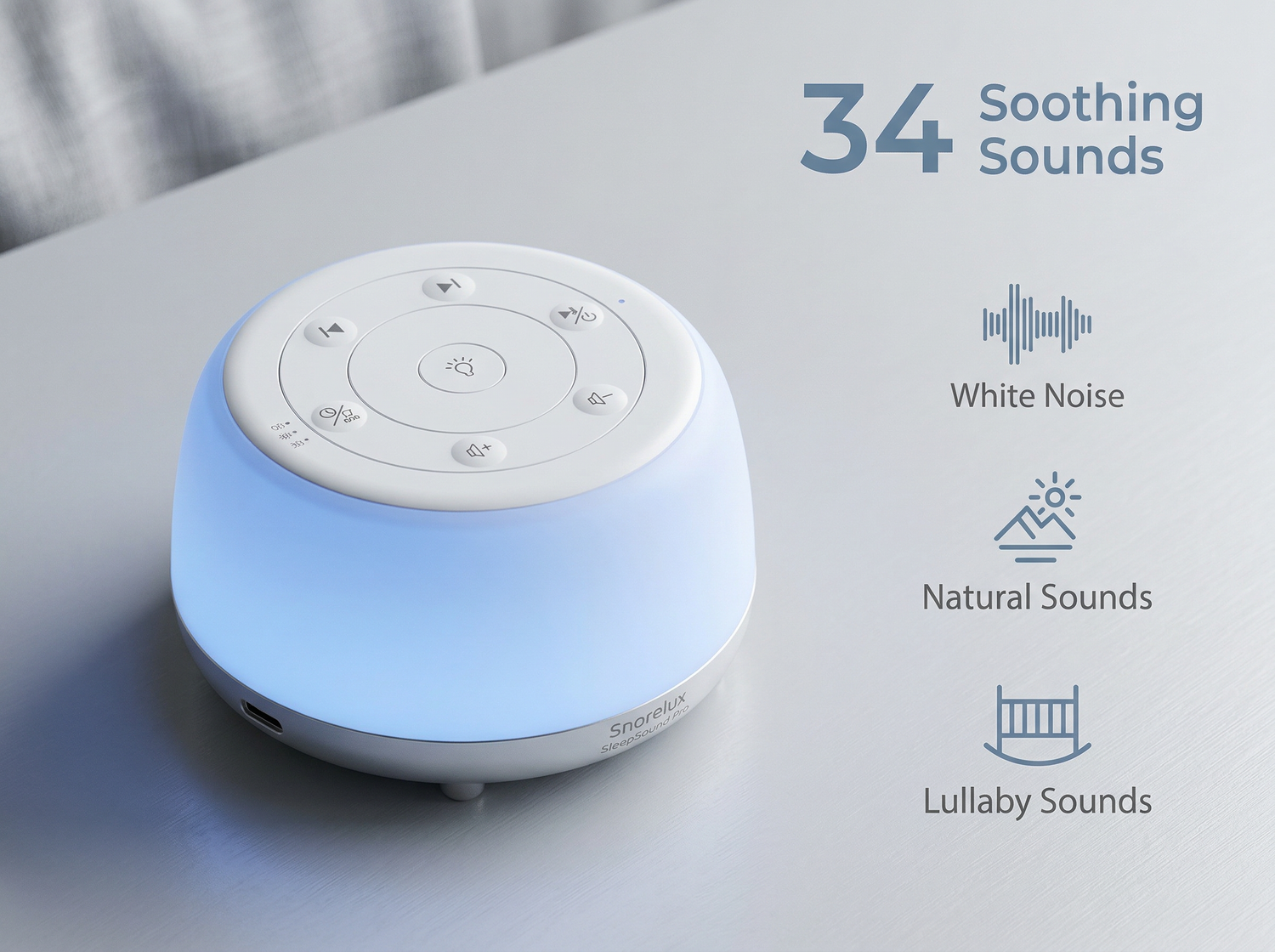 De Sleep Sound Machine beschikt over 34 vakkundig samengestelde geluidsopties, waaronder natuurgeluiden, ruis en slaapliedjes. Zo kunt u het geluid selecteren dat het beste bij uw slaapvoorkeuren past.